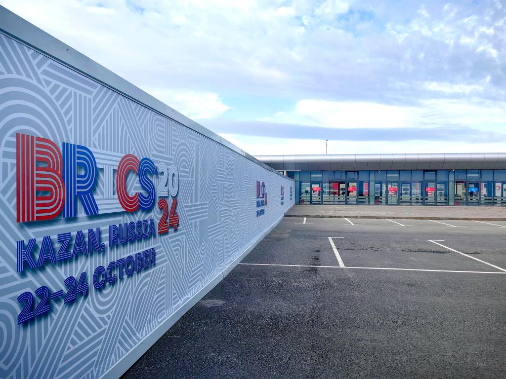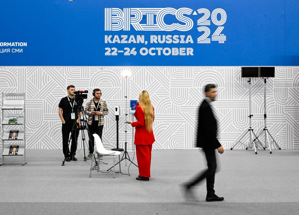 這是2024年10月23日在俄羅斯喀山金磚峰會新聞中心拍攝的金磚峰會標識。新華社記者 申宏 攝