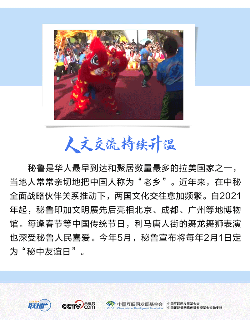 中國和秘魯都是文明古國,兩國友誼源遠流長,人民友好深入人心。習近平主席曾以“秘魯是中國在太平洋對岸的‘鄰居’”形容中秘關系,生動詮釋了兩國和兩國人民之間“相知無遠近”的深厚友誼。