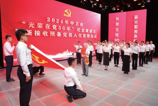 >> 2024年6月28日,中衛市直機關工委舉辦全市“光榮在黨50年”紀念章頒發暨新接收預備黨員入黨宣誓儀式。