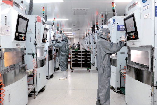 >> 2024年9月3日,在江蘇省宿遷經濟技術開發區聚燦光電科技(宿遷)有限公司數字化車間里,工人在生產線上趕制LED芯片外貿訂單。