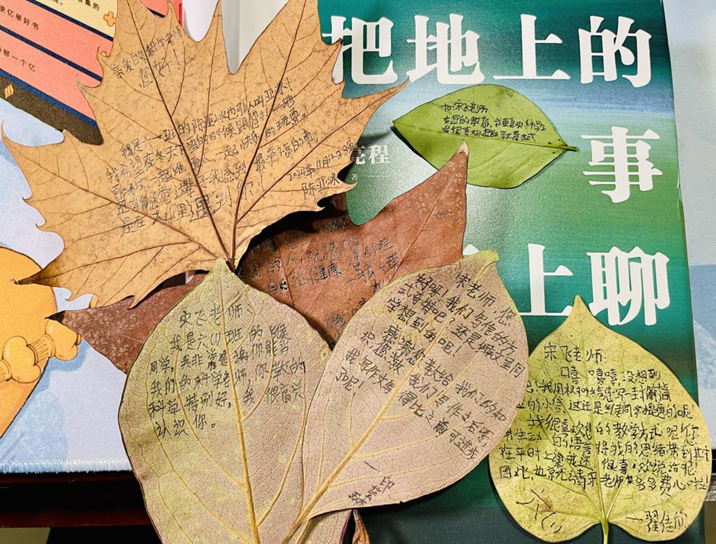 2024年11月12日,晚自習下課后剛出教室,六年級一班的緱同學便追出來神秘地遞給我一摞同學們“寫在樹葉上的信”。有的樹葉上畫著調皮可愛的笑臉和愛心——“我希望在冬天下雪的時候跟您打一場雪仗、一起堆雪人!”有的表達了誠摯的感謝——“宋老師,感謝您教給我們科學知識,我比之前可進步了呢!”有的則寫滿了對課堂的喜愛和對自我的期許——“我很喜歡您的教學方式呢!您用生動的語言將我的思緒帶到其中……”一片片樹葉上“鮮嫩”的字跡,承載著孩子們純真的情感和對未來的憧憬,也讓我感受到孩子們發自內心的親近。