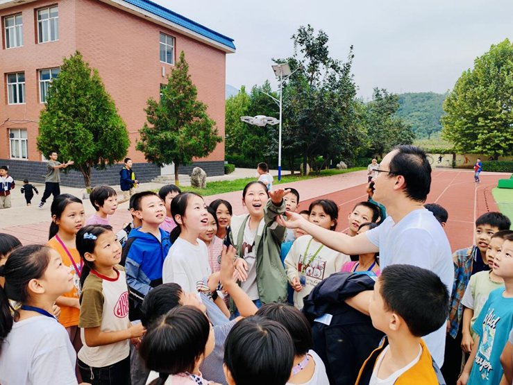 升空只是一剎那,如果能把火箭升空后長長的軌跡拍下來,一定會給孩子們留下更深刻的印象。我先買了一臺無人機練習空中追拍,利用課余時間帶著孩子們一塊兒在操場試飛,保證每個孩子都能親手操作。我教給他們最簡單的飛行指令,讓他們用小手掌當“停機坪”托起無人機,并用跟隨模式記錄下他們興奮奔跑和開懷大笑的瞬間。最后遙控降落時,只需再把手掌一抬,無人機就穩穩地回落到他們手心。水火箭實驗,計劃等這個學期結束后做,但我已經感受到了學生們的內心的期盼。有同學在作文中寫道:“老師帶來的無人機像是一雙可以翻越大山的眼睛,托起它的感覺就像讓夢想在手掌上起飛一樣!”