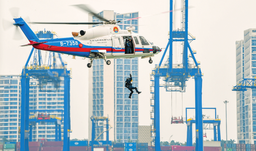 一架救援直升機從停機坪起飛,模擬高空救援流程,包括空降搜救人員、運送物資、轉移救助人員……演練內容一氣呵成,場面震撼?;顒蝇F場,專業救助船、救援直升機、深海搜救設備等逐一亮相,展現了??諏I救援實力。