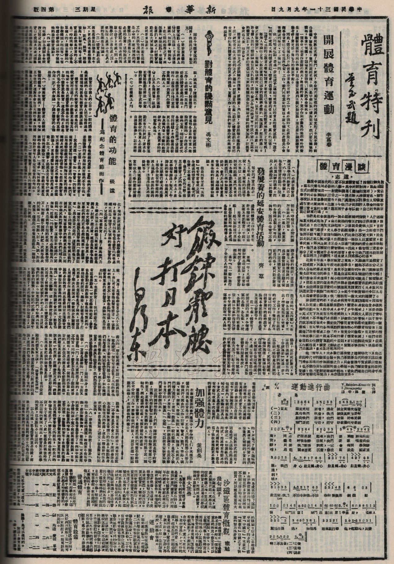 土地革命戰爭時期,毛澤東非常重視各革命根據地的體育運動,1934年1月他在第二次全國蘇維埃代表大會上的報告中專門提到:“群眾的紅色體育運動也是迅速發展的?,F雖偏僻鄉村中也有了田徑賽,而運動場則在許多地方都設備了?!比褡蹇箲饡r期,在毛澤東等中央領導同志的關懷關心下,抗日根據地的體育運動繼續頑強地向前發展。1937年8月6日,毛澤東在陜甘寧邊區第一屆抗戰動員體育運動大會閉幕詞中提出,要努力學習軍事體育來武裝我們的手足,學習政治來武裝我們的頭腦。1942年9月9日,《新華日報》刊發了毛澤東的題詞“鍛煉體魄,好打日本”,當日恰逢國民政府組織的第一屆體育節,毛澤東的題詞對在抗戰戰略相持階段鼓舞民心士氣、鞏固抗日民族統一戰線、推動抗日軍民以堅強體魄和必勝信心奪取抗戰最終勝利起到了積極作用。