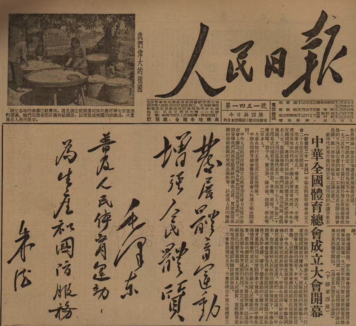 1952年6月22日,《人民日報》刊發了毛澤東為中華全國體育總會成立大會所作的題詞“發展體育運動,增強人民體質”。題詞高度凝練概括了毛澤東的體育思想,同時也指明了社會主義新中國體育事業的宗旨所在、使命所在,為體育工作指明了方向。1957年2月27日,毛澤東在最高國務會議第十一次(擴大)會議上的講話中明確提出:“我們的教育方針,應該使受教育者在德育、智育、體育幾方面都得到發展,成為有社會主義覺悟的有文化的勞動者?!睂Ⅲw育列入了培養新社會所需的勞動者最重要的三方面內容之一。1960年3月16日,毛澤東在為中共中央起草的關于衛生工作的指示中提出,“凡能做到的,都要提倡做體操,打球類,跑跑步,爬山,游水,打太極拳及各種各色的體育運動”,將廣泛開展多樣化的群眾體育健身運動作為消除嚴重疾病、改造人民低弱體質的重要舉措。