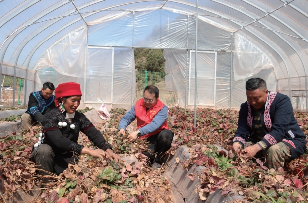 2025年2月,四川省昭覺縣煙草專賣局(分公司)派駐第一書記(右二)組織村民給草莓打葉除草。