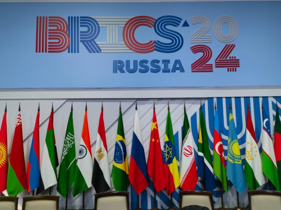 這是2024年10月24日在俄羅斯喀山拍攝的金磚峰會標識和國旗。新華社記者 李學仁 攝