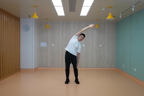1、體側屈:站姿,一側手側平舉,肘關節屈曲,向對側伸展,保持3-5秒,交換對側,單側進行3-5次為1組,重復2-3組,組間休息60秒。