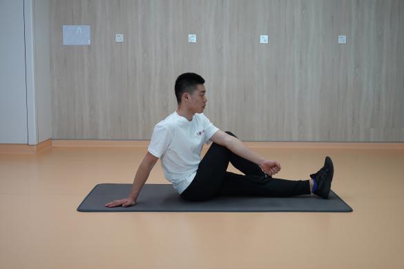 4、臀大?。鹤阼べ|上,一側腳放在對側膝關節外側,對側肘關節放在屈曲膝關節外側,軀干向后側扭轉,保持3-5秒,單側進行3-5次為1組,重復2-3組,組間休息60秒。