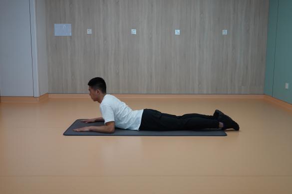 6、眼鏡蛇式:俯臥在瑜伽墊上,雙手在胸部兩側,雙手將軀干支撐離地,保持3-5秒,進行3-5次為1組,重復2-3組,組間休息60秒。