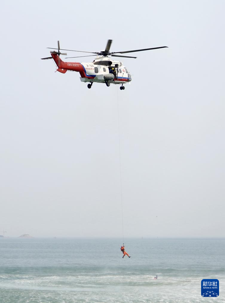 5月27日,參加演訓的救助直升機從海上救起落水人員。