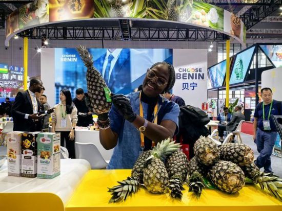 2024年11月7日,在上海舉行的第七屆中國國際進口博覽會上,貝寧國家館工作人員展示本國特色農產品——貝寧菠蘿。新華社記者 郝王樂 攝
