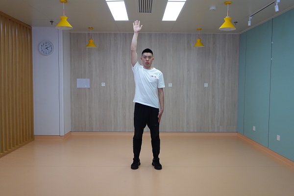 (2)戰士式:站姿,單腳后撤呈弓箭步并伴隨雙臂上舉,再回到站姿,左右交替為一次,一組進行10-12次,重復2-3組,組間休息60秒。