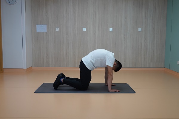 (3)牛貓式:四足跪姿,頭部向胸骨方向內收,呈駝背姿勢,保持3-5秒,進行3-5次為1組,重復2-3組,組間休息60秒。
