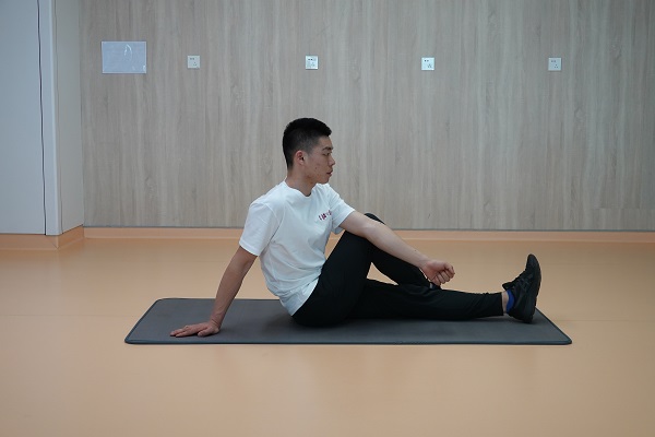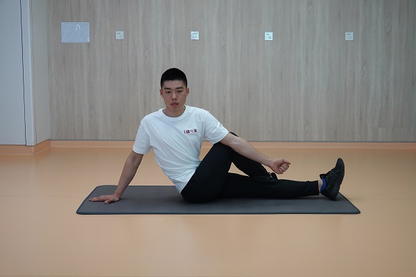 (6)臀大肌伸展練習:坐在瑜伽墊上,一側腳放在對側膝關節外側,對側肘關節放在屈曲膝關節外側,軀干向后側扭轉,保持3-5秒,單側進行3-5次為1組,重復2-3組,組間休息60秒。