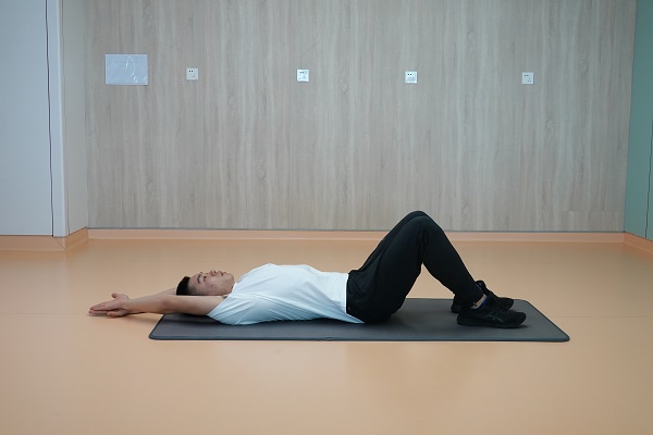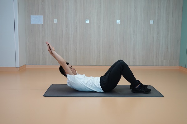 3、屈身雙臂高舉:仰臥位,雙腳踩地,兩手在頭上方,兩手同時上抬靠近兩膝關節,一組進行10-12次,重復2-3組,組間休息60秒。