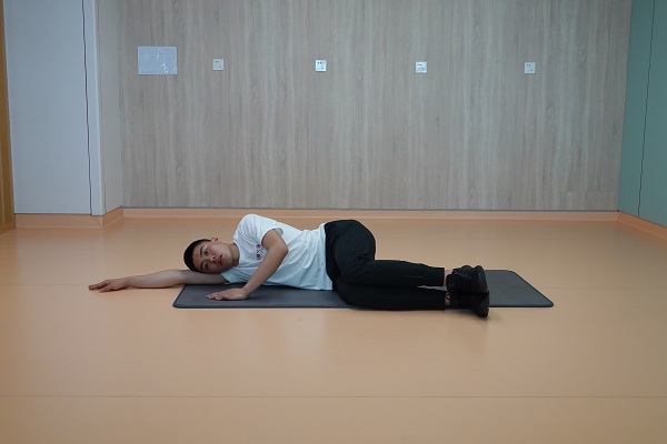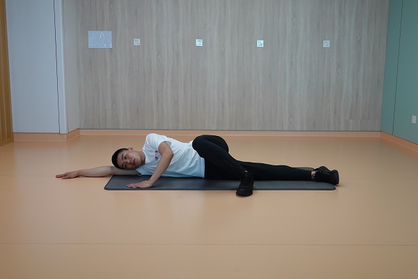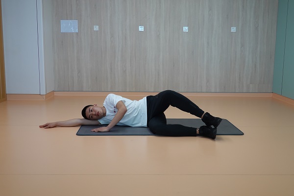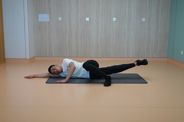 4、側臥收髖:側臥位,上側腳踩在下側膝關節前方,下側腿做反復抬起運動,一組進行10-12次,重復2-3組,交換對側重復,組間休息60秒。