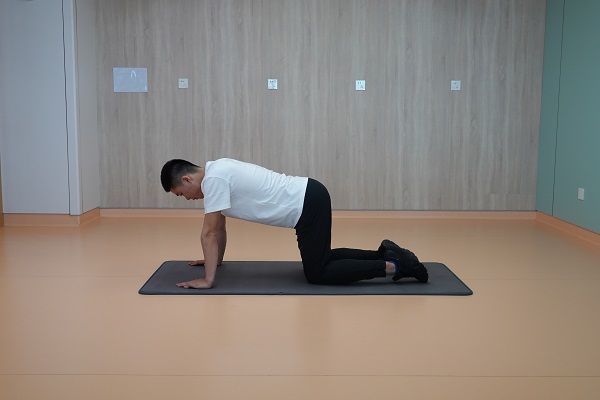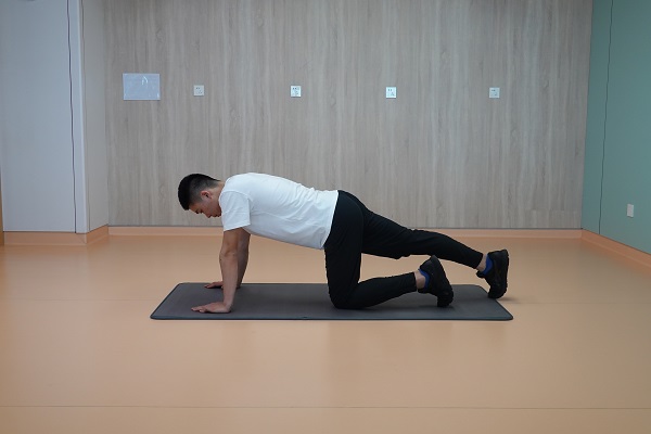 6、四足式大腿內收:四足跪姿,單腿后伸,下肢抬起做髖關節內收外展動作,一組進行10-12次,重復2-3組,交換對側重復,組間休息60秒。