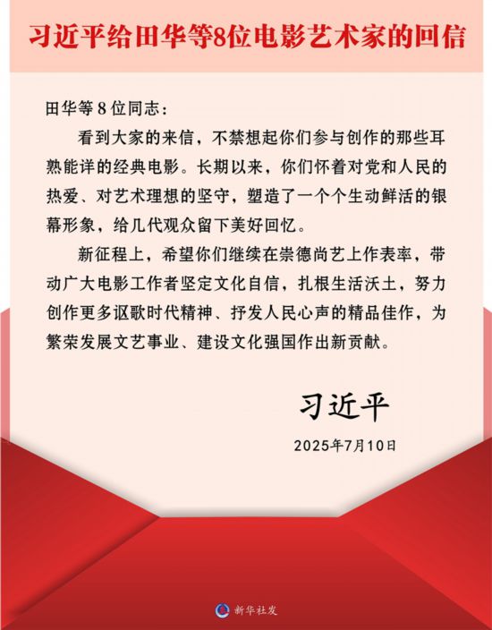 新華社北京7月11日電 近日,中共中央總書記、國家主席、中央軍委主席習近平給田華等8位藝術家回信,對電影工作者提出殷切期望。