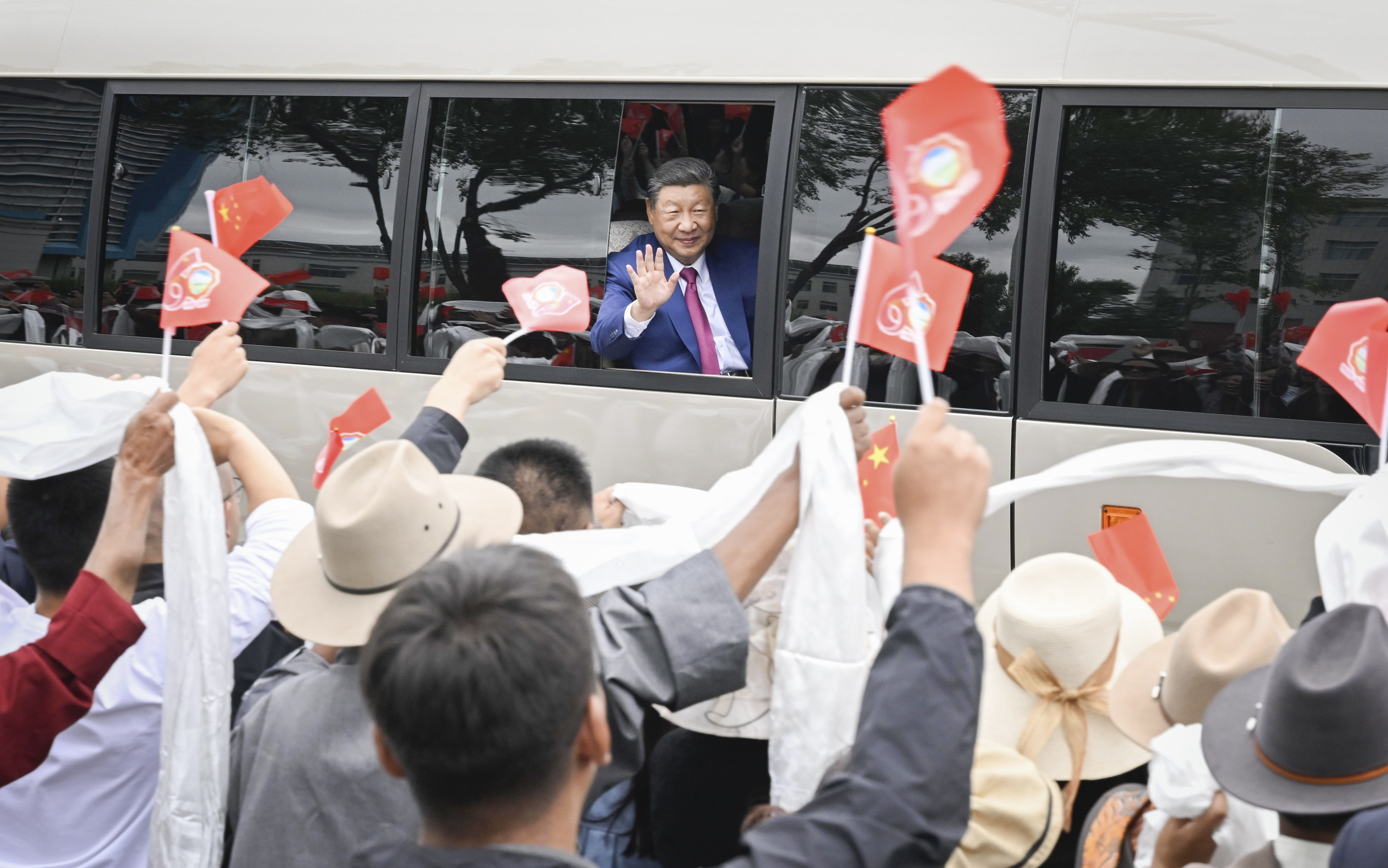 中共中央總書記、國家主席、中央軍委主席習近平率中央代表團20日中午乘專機抵達拉薩,出席西藏自治區成立60周年慶?;顒?。習近平等在機場和拉薩市區受到西藏各族群眾的熱烈歡迎。中共中央政治局常委、全國政協主席、中央代表團團長王滬寧,中共中央政治局常委、中央辦公廳主任蔡奇等同機抵達。